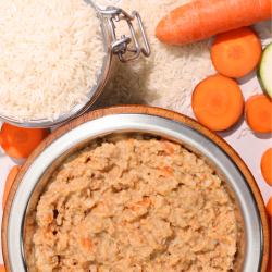 BIO arroz, BIO carne de músculo de pollo, BIO zanahorias, BIO hígado de pollo, BIO aceite de girasol de 1ª prensado, carbonato cálcico.